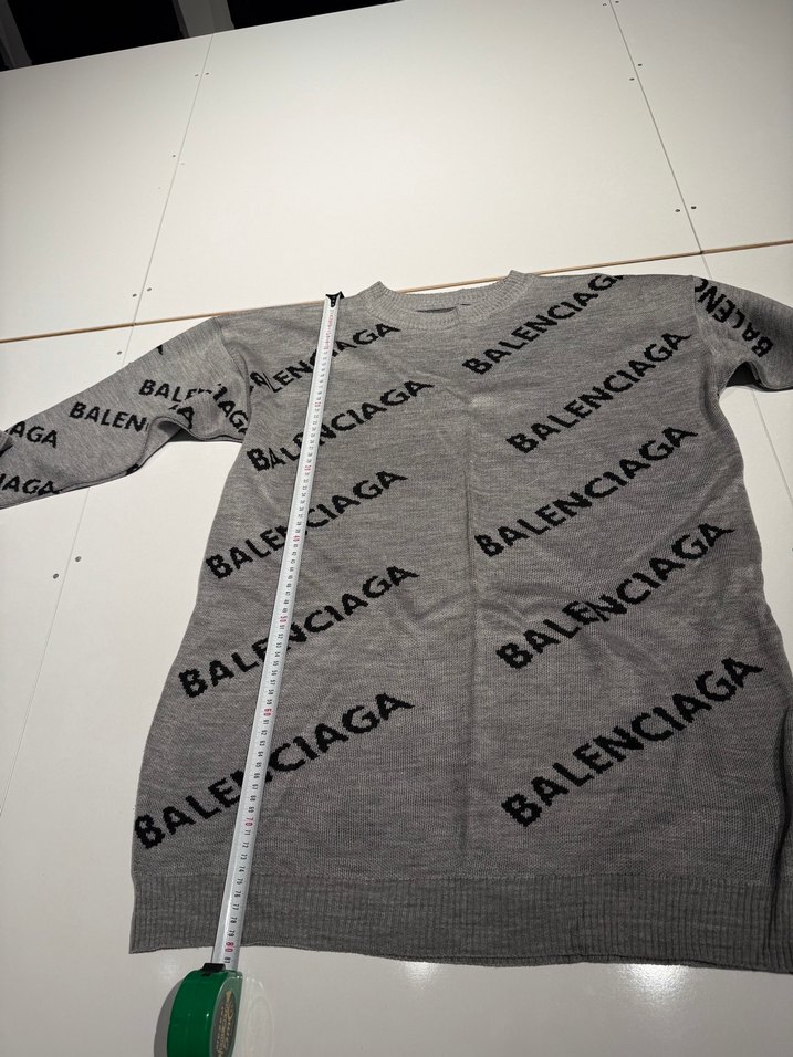 Gri renkte, üzerinde siyah Balenciaga logosu tekrar eden yumuşak dokulu uzun kollu kazak. Yuvarlak yaka detayına sahiptir.