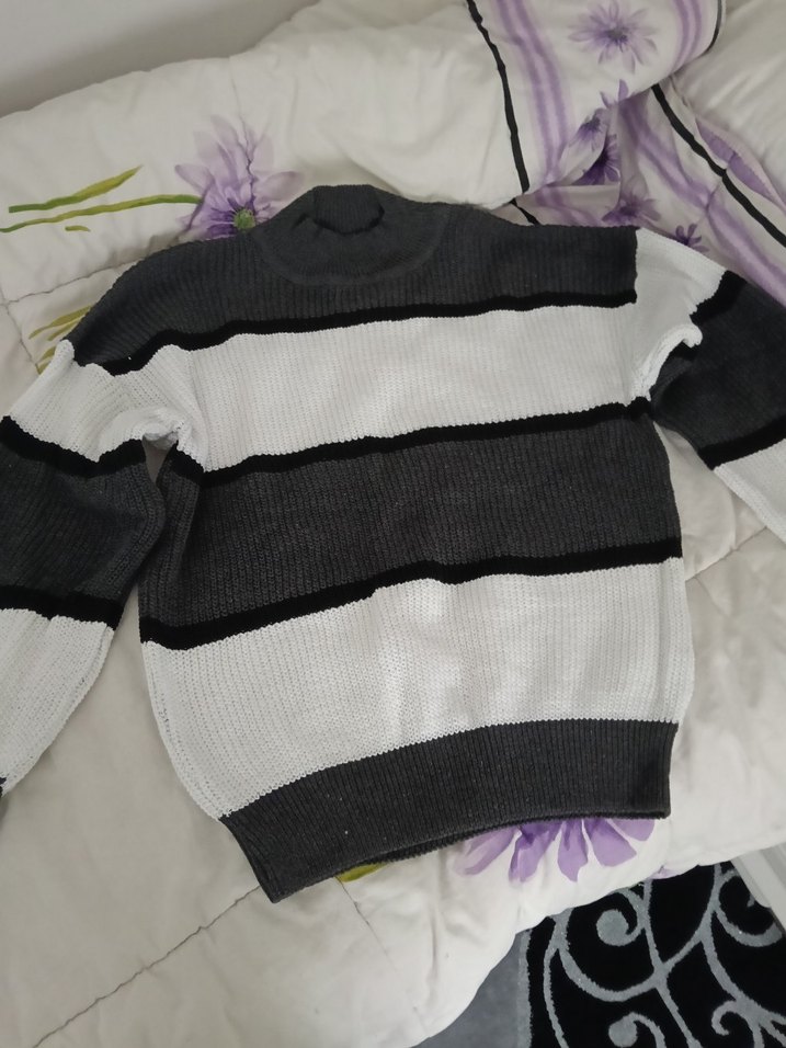 Kadın kazak, uzun kollu ve balıkçı yaka olup, örme kumaştan yapılmıştır. Gri ve beyaz yatay çizgilidir, rahat kesim ve sokak modası tarzındadır. standart beden