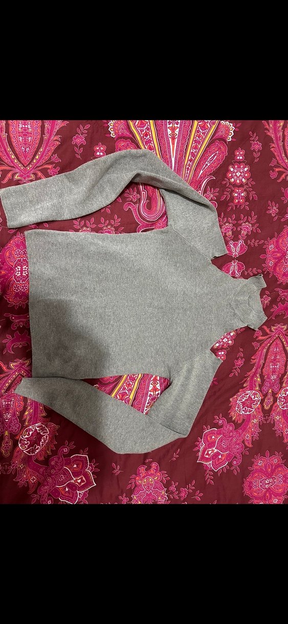 Gri renkli, balıkçı yaka ve uzun kollu, vücuda oturan örme kadın kazak. Yumuşak sentetik kumaştan, günlük kullanım için rahat ve sıcak tutar.