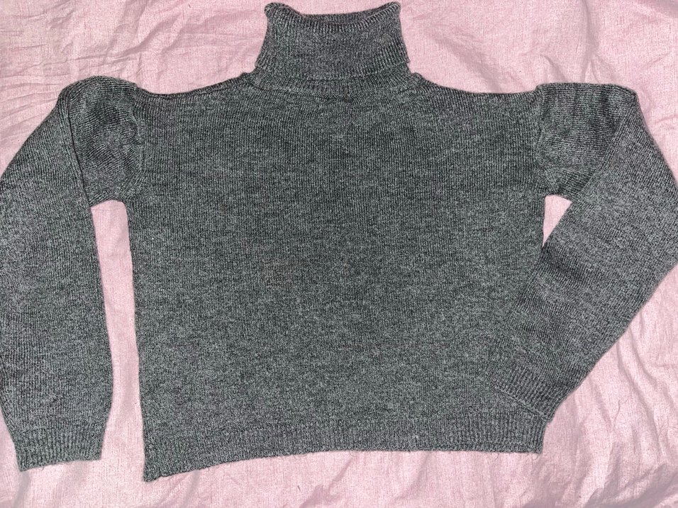 Gri balıkçı yaka ve uzun kollu, örme triko kumaştan yapılmış, rahat kesimli ve normal boyda kadın kazak. Günlük kullanıma uygundur.