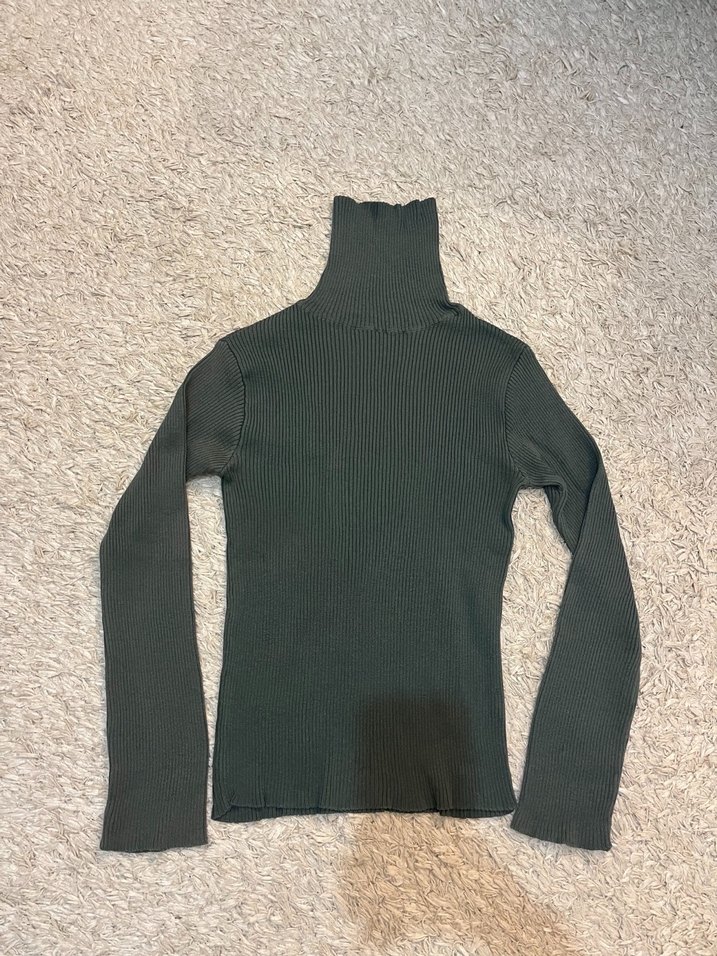 Yeşil renkte, balıkçı yaka ve uzun kollu, vücuda oturan kazak. Yumuşak sentetik kumaştan, midi boyda ve desensiz, günlük kullanım için uygun.