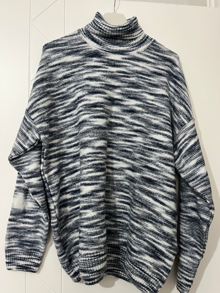 Gri renkli, balıkçı yaka ve uzun kollu örgü erkek kazak. Bol kesimi ve batik desenleriyle rahat, günlük kullanıma uygun bir sokak stili kazak.