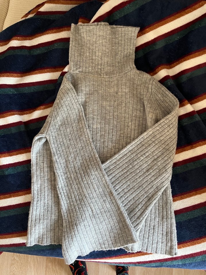 Gri renkli, balıkçı yaka ve uzun kollu, örgü dokulu, normal uzunlukta ve vücuda oturan kadın kazak.