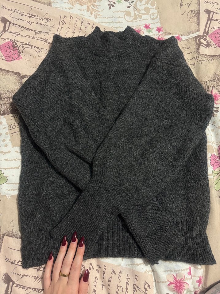 Gri renkli, balıkçı yaka ve uzun kollu, örgü dokusuyla rahat ve sade bir kadın kazak. Günlük kullanıma uygun.