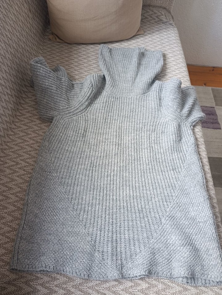 Gri renkte, balıkçı yaka ve uzun kollu, triko dokulu, vücuda oturan rahat ve şık kadın kazak.