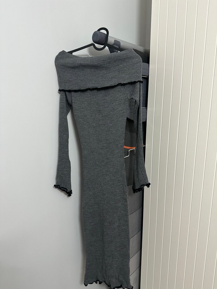 Gri renkte, uzun ve vücuda oturan bu elbise, balıkçı yaka ve uzun kollara sahip. Yumuşak triko kumaştan yapılmıştır, rahat ve günlük kullanım için uygundur.