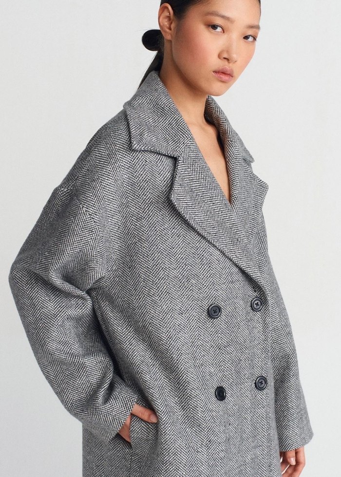Gri balıksırtı desenli, çift düğmeli ve geniş yakalı rahat kesim kaban.