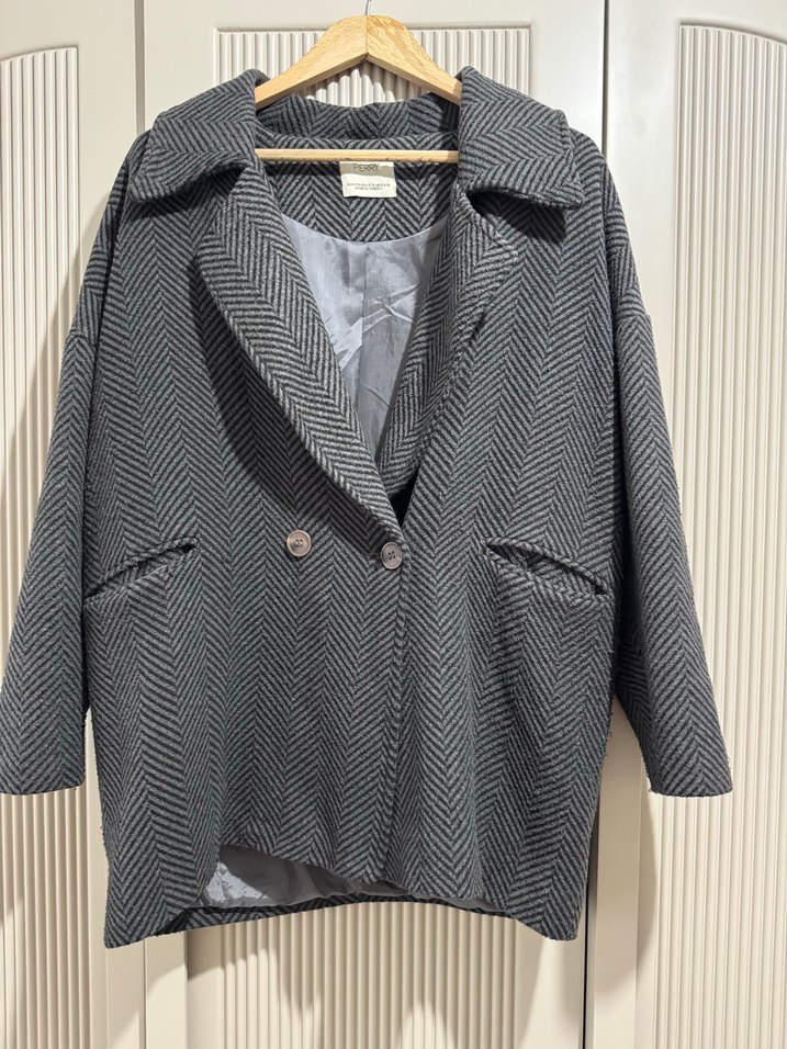 Gri balıksırtı desenli kaban, çift düğmeli ve yan ceplidir. Yumuşak astarı ve rahat kesimiyle soğuk havalar için uygundur.
