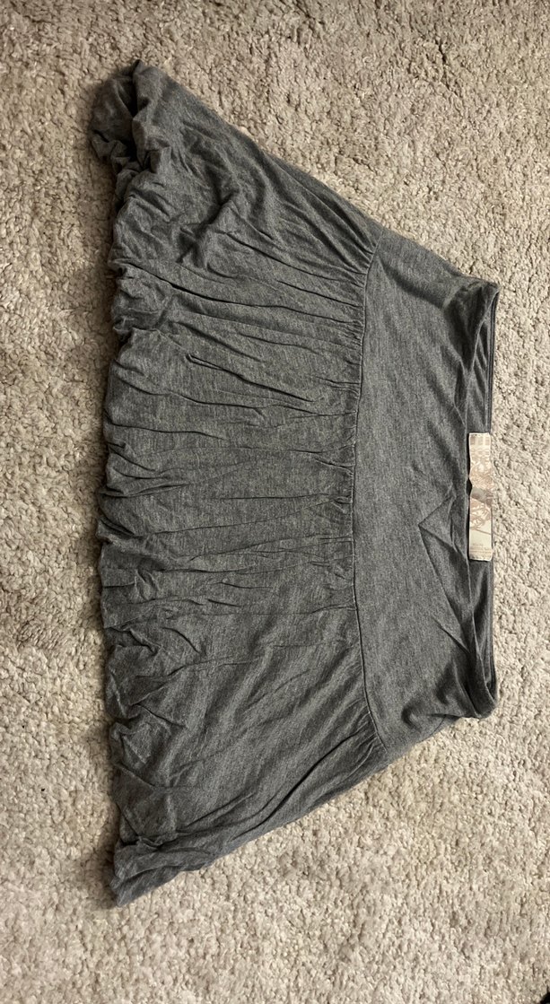 Gri keten midi etek, bol kesim ve volan detaylarıyla rahat ve bohem bir stil sunar. Günlük kullanıma uygun, trend casual görünüme sahiptir.