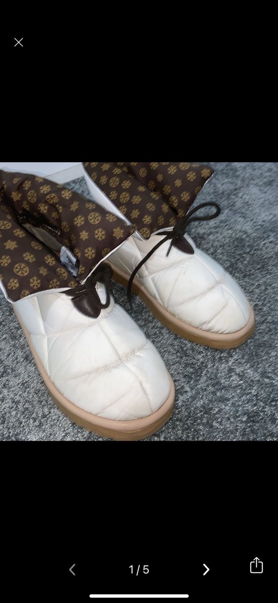Beyaz renkte, gri bant detaylı, dolgu topuklu ve tokalı kadın botları. Sonda hafif lekesi vardır ama göze batmıyor uğraşılırsa belki geçer