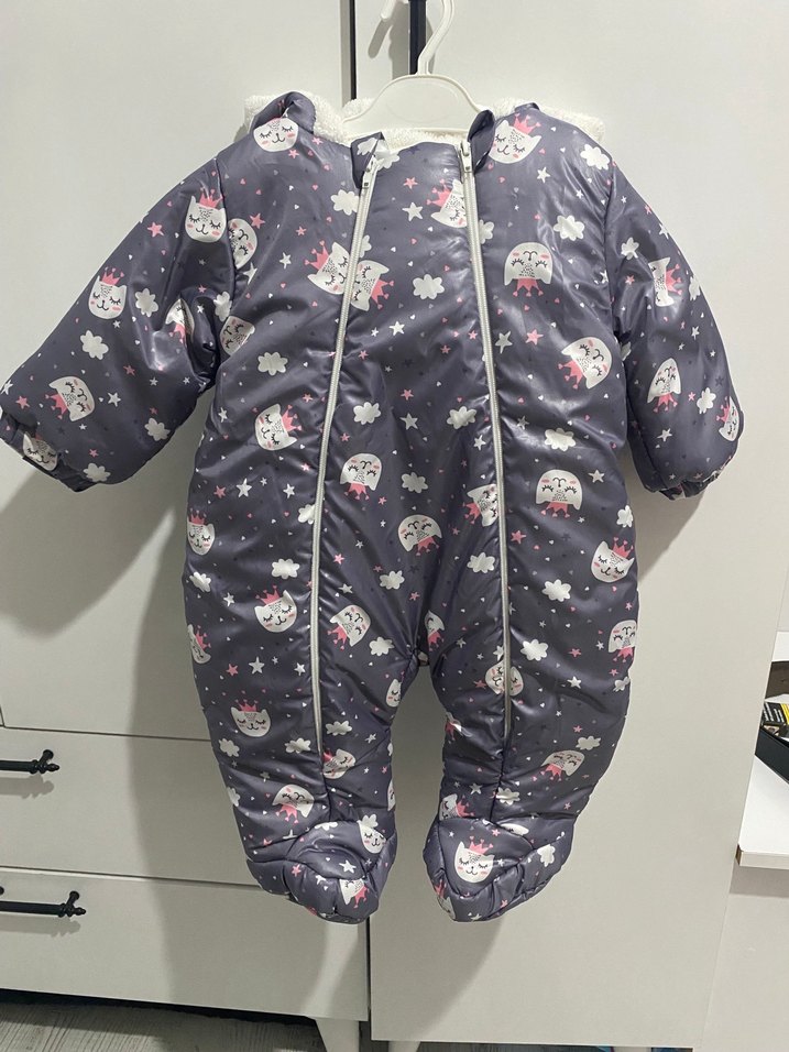 Gri renkli, baskılı desenli, kürk detaylı ve bisiklet yaka bebek kış tulumu. Soğuk havalar için yumuşak ve sıcak tutar.