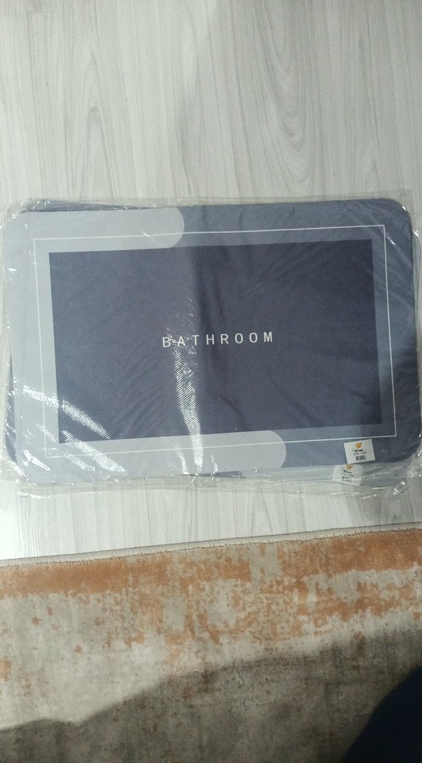Üzerinde 'BATHROOM' yazısı bulunan gri baskılı banyo paspası.