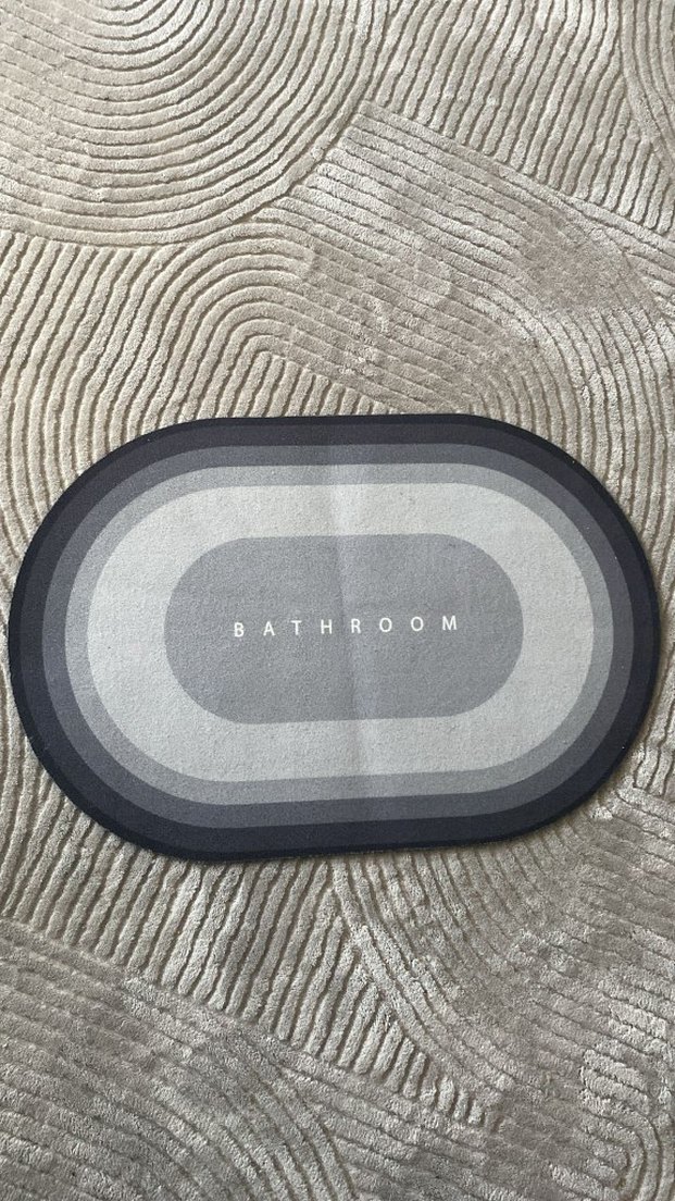 Ortada "BATHROOM" yazısı bulunan, çeşitli gri tonlarında baskılı oval şekilli banyo paspası.