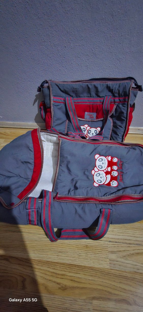 Gri renkte, kırmızı detaylı ve ayıcık baskılı geniş bebek çantası