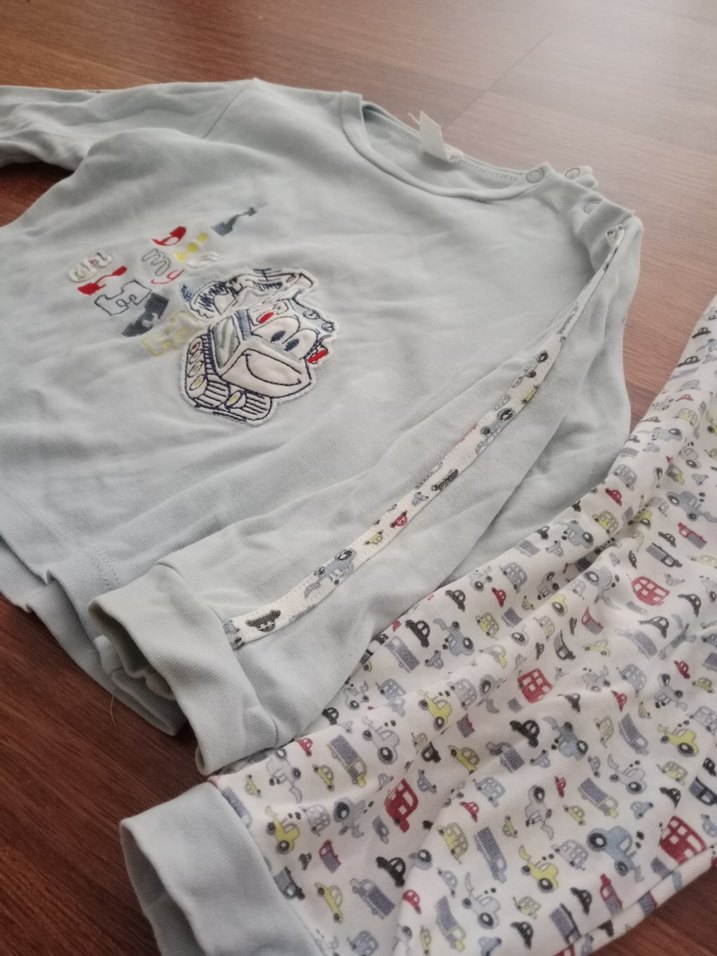 Uzun kollu, düğmeli ve baskılı gri pamuklu bebek erkek takımı. Üst ve desenli pantolon sokak stili için uygundur. iki pijama takımı