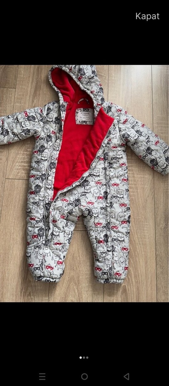 Gri baskılı, kürklü detaylı bebek erkek tulumu, kırmızı yumuşak iç astarlı, sokak stili için uygundur. ❄️62 / 68yakl. 6 aya kadar