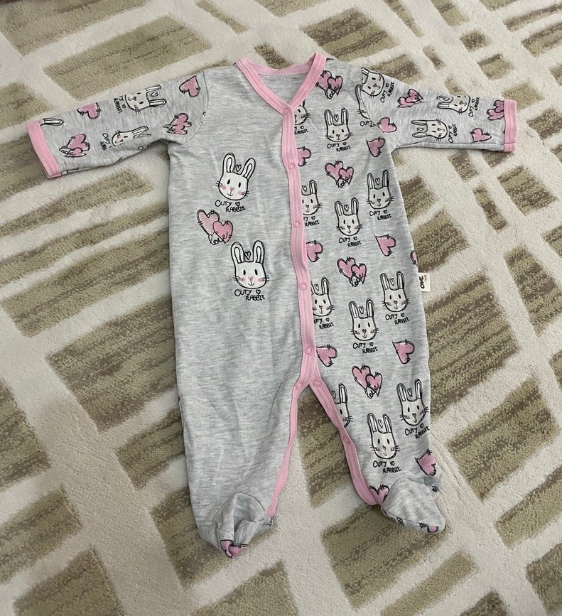 Gri bebek tulumu, sevimli tavşan yüzleri ve kalplerle baskılıdır. Pembe kenar detayları, ayaklı tasarım ve önden çıtçıtlı kapanış içerir.