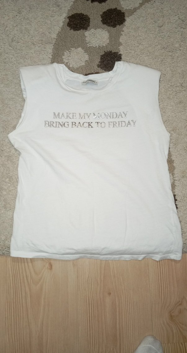 Pamuk kumaştan, gri baskılı yazılı, kolsuz beyaz hamile tişörtü. Salaş kesimli ve yuvarlak yakalı, rahat ve şık bir günlük seçim.