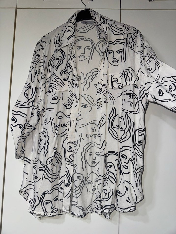 Gri yüz baskılı, keten kumaştan, yakalı ve düğmeli, bol kesim uzun kollu gömlek. Günlük kullanıma uygun normal boyda.