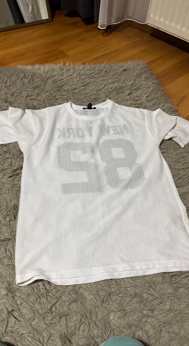 Gri baskılı, beyaz renkli, kısa kollu tişörtü. Salaş kesim, örme dokulu ve bisiklet yaka özelliklerine sahiptir. Normal uzunluktadır ve gündelik kullanıma uygundur.Ben genelde elbise olarak kullanıyorum