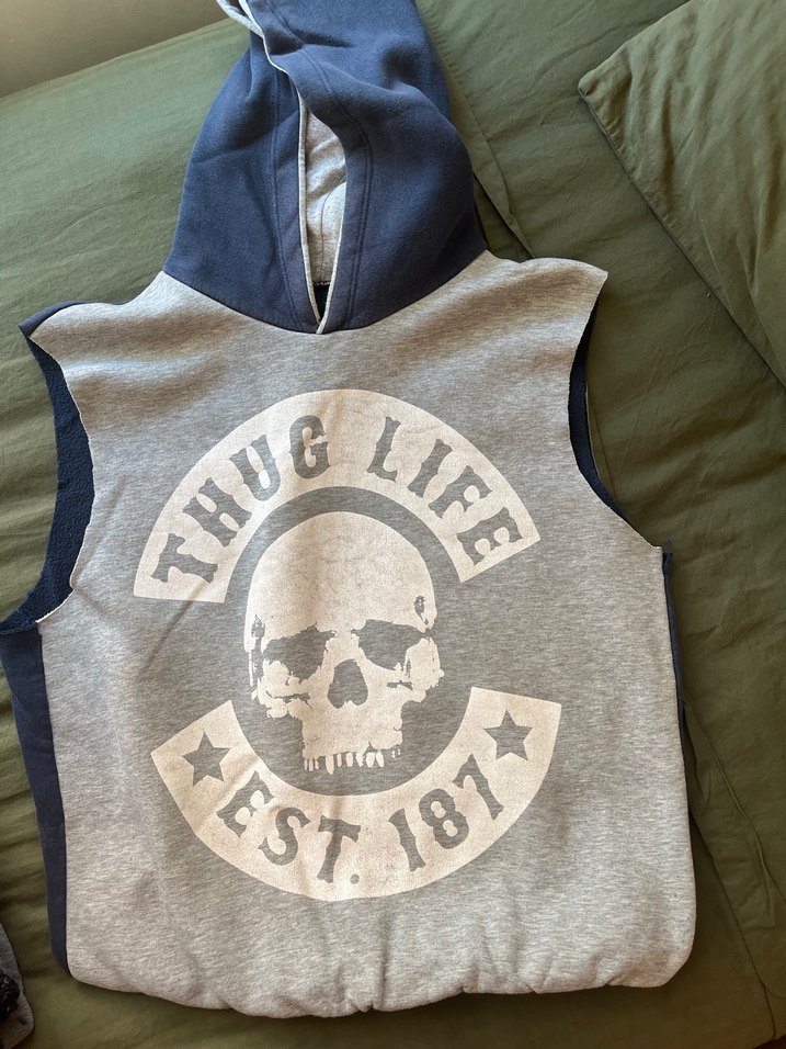 Unisex Gri renkli, baskılı kafatası desenli ve 'THUG LIFE' yazılı, kolsuz sweatshirt . Salaş kesim, bisiklet yaka.