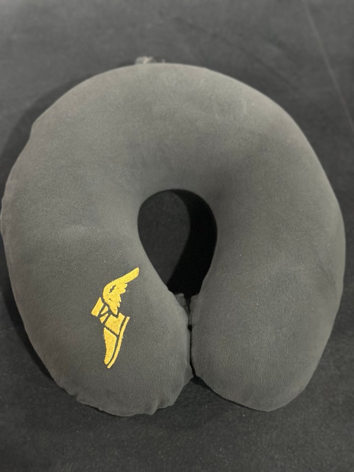 Amazon’dan almıştım sadece 1-2 kez kullandım . Sıfır gibi temiz . Gri renkli, yumuşak dokulu boyun yastığı üzerinde sarı renkli kanatlı ayakkabı baskısı bulunmaktadır.