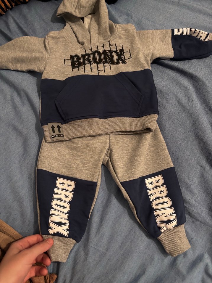 Gri baskılı Bronx yazılı kapüşonlu üst ve pantolondan oluşan bebek eşofman takımı, yumuşak ve sıcak kumaştan üretilmiştir. Uzun kollu, bisiklet yaka ve tokalı detaylara sahiptir. Marka temsili