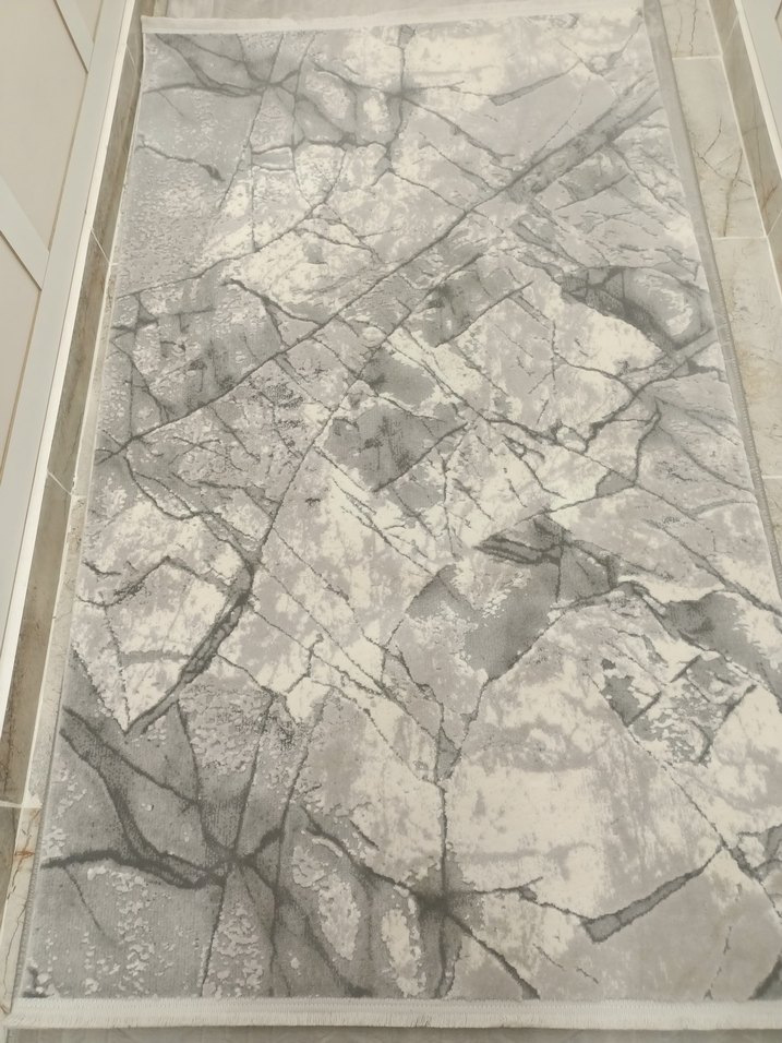 Yumuşak yüzeyli, gri mermer desenli baskılı çağdaş halı, modern bir dokunuş sağlar. en 1 boy 1.70