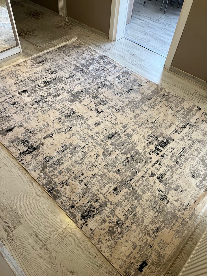 Farklı gri tonlarında baskılı desene sahip çağdaş tarzda halı. Modern iç mekanlara uygun yumuşak dokulu 4 m2 sıfır paketli