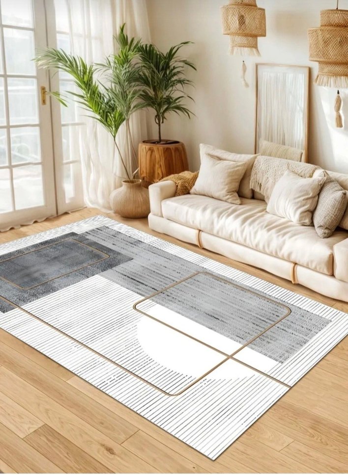 Gri tonlarında baskılı geometrik desenli çağdaş halı, modern iç mekanlara uyum sağlar. İnce altın çizgilerle detaylandırılmıştır. süngerli kaymaz dot taban halı