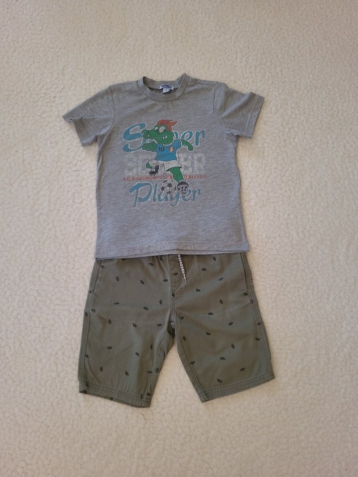Pamuklu gri kısa kollu erkek cocuk tişörtü, baskılı. Desenli şortla tamamlanmış, Ürün kullanildi hafif renklerinde solma var