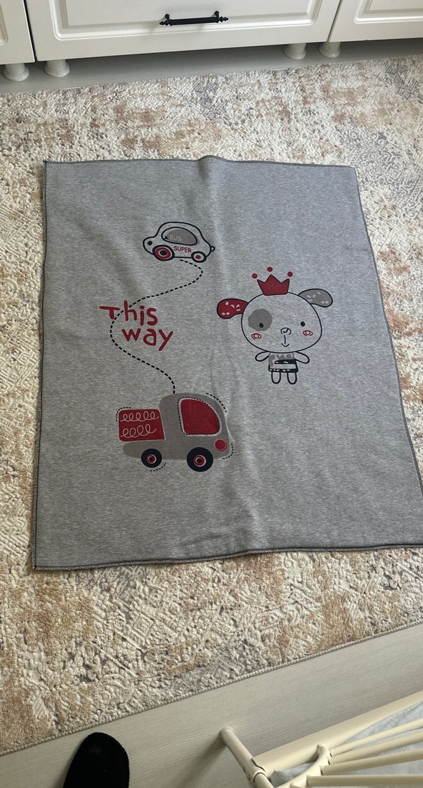 Yumuşak ve sıcak gri çocuk battaniyesi, baskılı sevimli araba ve köpek desenleriyle. Kırmızı detaylar ve "This way" yazısı içerir. Eni 80 boyu 1 metre