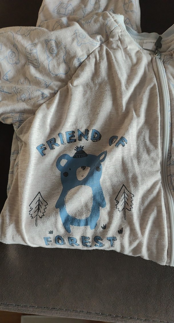 Yumuşak gri çocuk battaniyesi, mavi ayı ve orman desenli baskıya sahip, sıcak tutan fleece kumaştan üretilmiştir. Fermuarlı kapanış içerir.