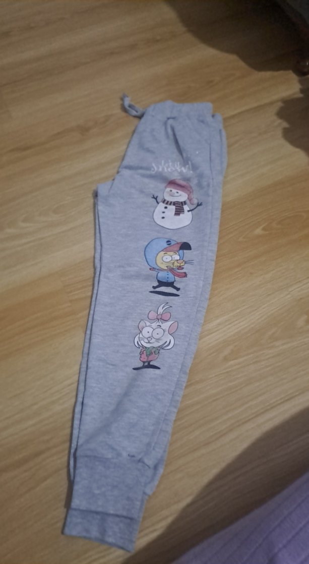 Gri renkli, baskılı çizgi karakter desenli, elastik bel bantlı kadın eşofman altı. Yumuşak ve sıcak kumaştan günlük kullanıma uygun rahat kesim.
