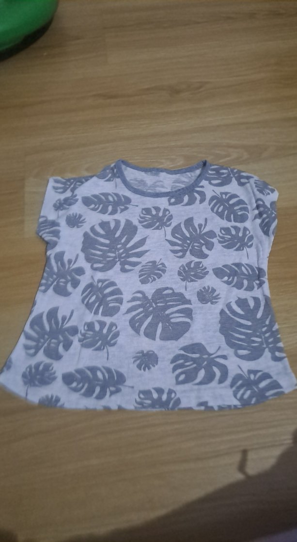 Gri baskılı, kısa kollu, yuvarlak yakalı kadın tişörtü. Sentetik kumaştan, bol kesim ve günlük rahat kullanım için uygundur.