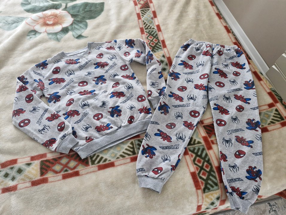 Gri renkte, baskılı desene sahip çocuk pijama takımı, yumuşak ve sıcak tutan kumaştan üretilmiştir. yikandi cekti ondan olmadi