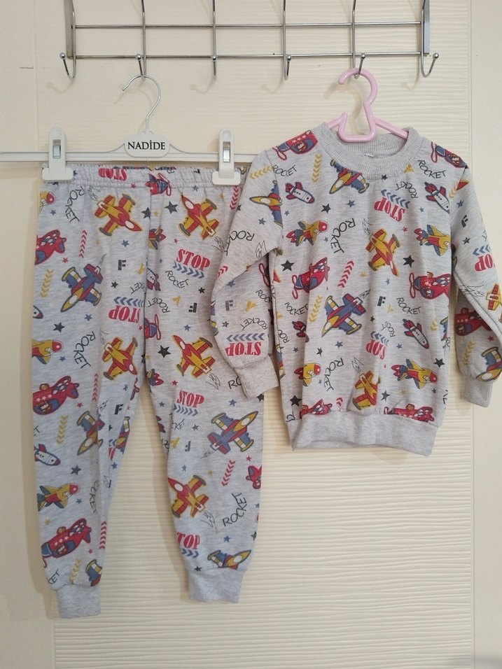 Gri renkli, uçak ve yazı baskılı çocuk pijama takımı. Yumuşak ve sıcak kumaştan üretilmiştir, uzun kollu üst ve pantolondan oluşur. ✈️