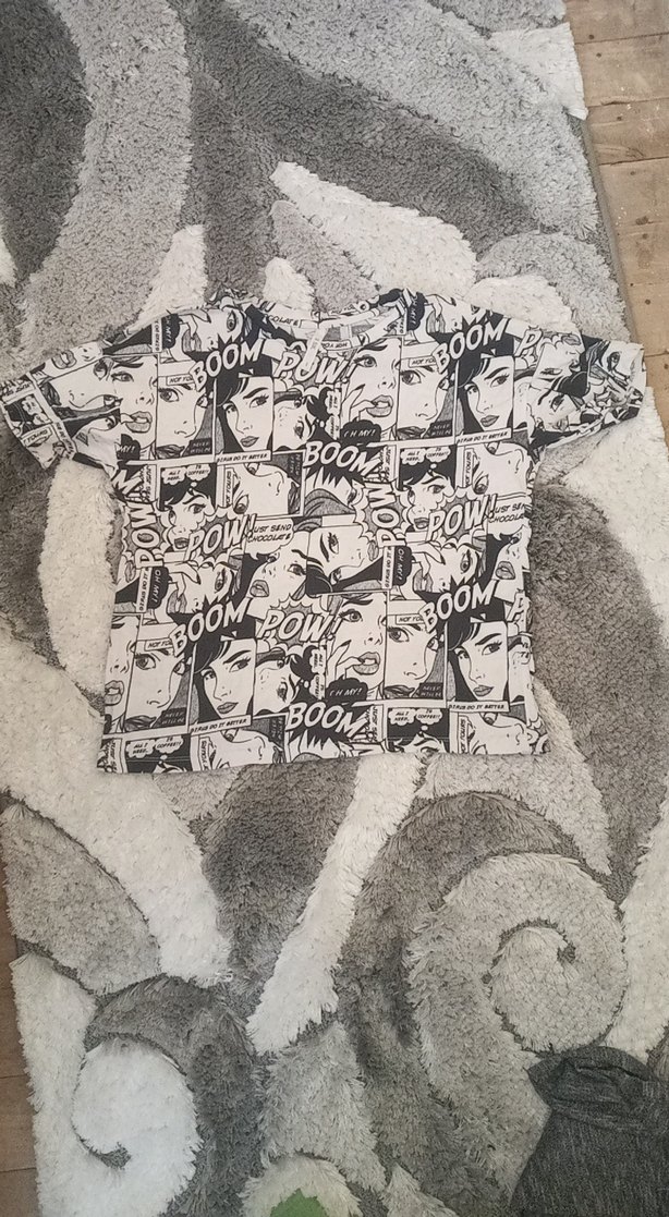 Gri baskılı, kısa kollu, bol kesim çocuk tişörtü. Pamuklu kumaştan, tekne yaka ve çizgi roman tarzı desenlerle sokak modasına uygun rock punk havasında.