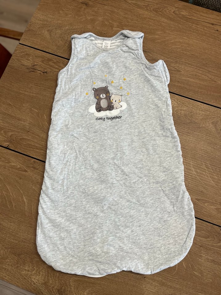 Yumuşak ve sıcak kumaştan yapılmış, üzerinde ayı ve tavşan baskısı bulunan gri çocuk uyku tulumu. Kolsuz yapısıyla rahat uyku sağlar.
