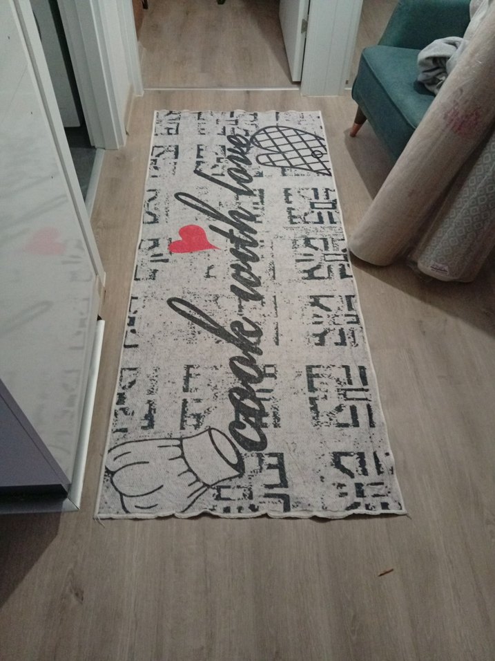 Gri renkte, baskılı ve counterculture tarzında grafik desenli halı, mekana özgün bir şehir havası katıyor.
