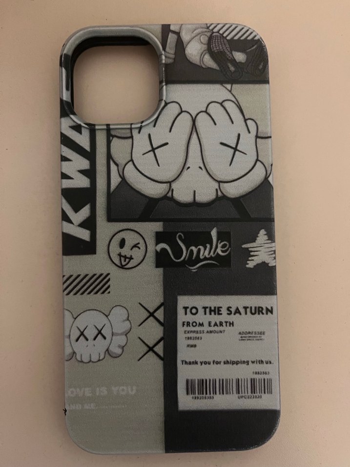 Gri renkte, baskılı grafik ve yazılar içeren counterculture tarzında iphone13 telefon kılıfı.