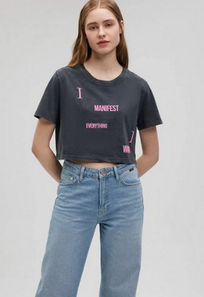 Gri Baskılı Denim Kadın Tişört