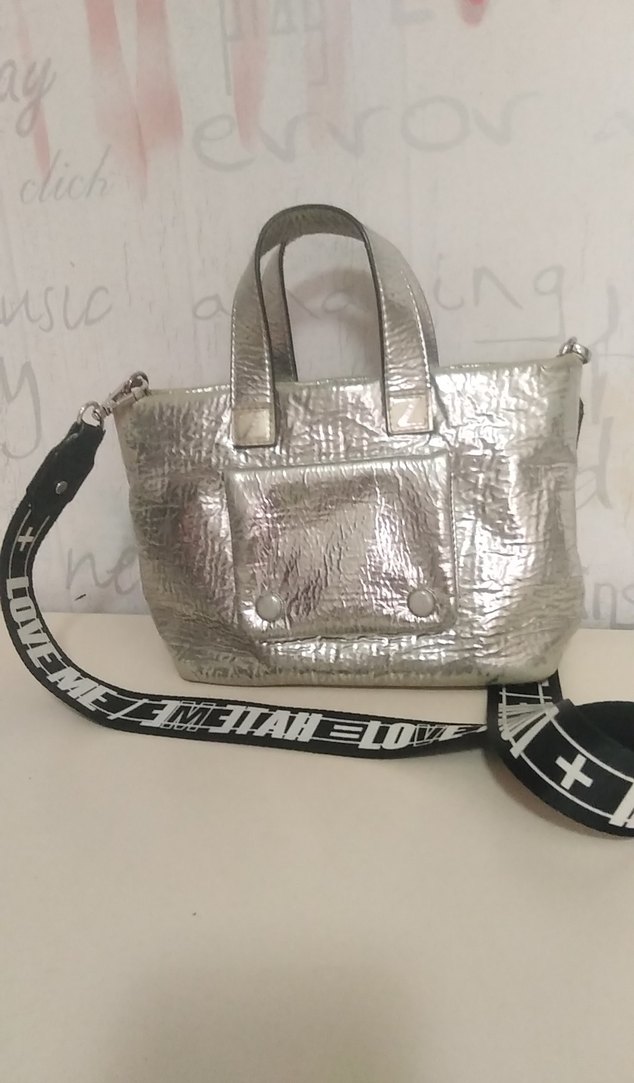 Gri deri çanta, baskılı dokusu ve tokalı detaylarıyla dikkat çekiyor. Çıkarılabilir bant üzerinde cesur yazılar bulunur, sokak modasına uygundur. Ufak kusurları vardır