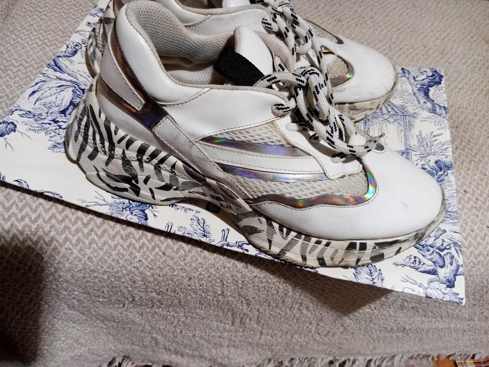 Beyaz kadın spor ayakkabılar, dolgu topuk ve gri baskılı taban detayına sahiptir. Bağcıklı olup, sokak stili ve günlük kullanım için uygundur.