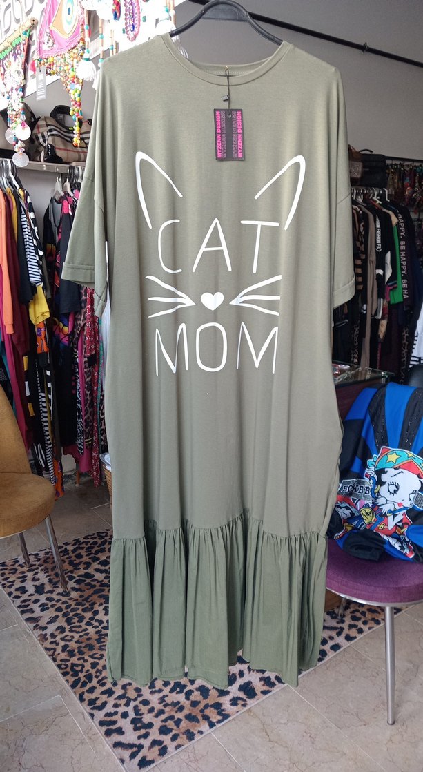 Gri renkte, baskılı kedi yüzü ve "CAT MOM" yazılı, drapeli ve streetwear tarzında elbise.