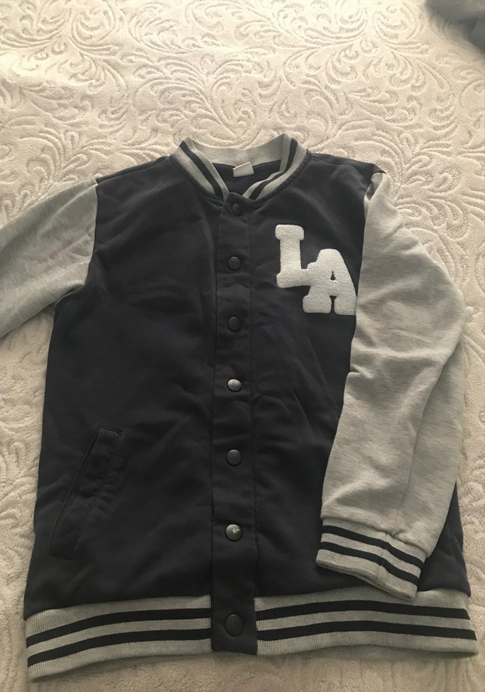 Gri baskılı kollara ve düğmeli kapamaya sahip, bol kesim erkek çocuk ceketi. Yumuşak ve sıcak kumaştan, sokak stili için uygun.