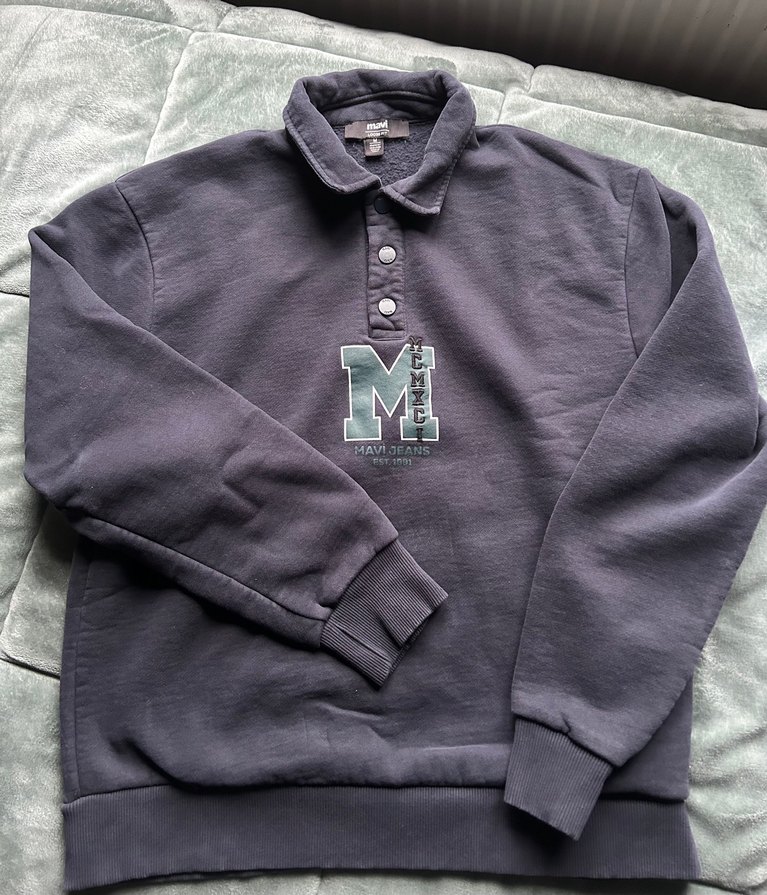 Gri, düğmeli ve yakalı uzun kollu sweatshirt, baskılı detaylıdır. Rahat kesim ve yumuşak, sıcak kumaştan üretilmiştir.