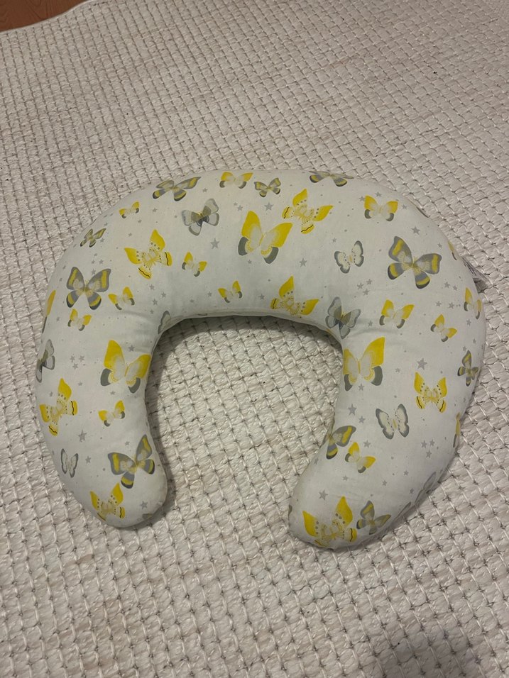 Gri renkte, sarı ve gri kelebek desenli hamile ve emzirme yastığı, rahatlık ve destek sağlar.