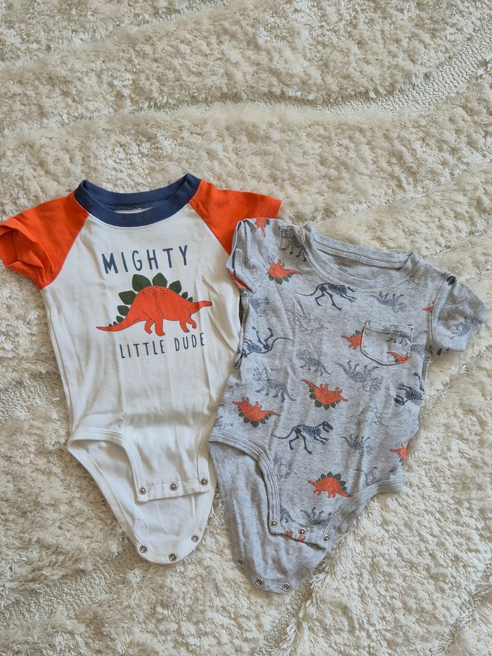 Gri renkli, kısa kollu pamuklu erkek bebek body, dinozor baskılı ve yüksek yakalıdır. "MIGHTY LITTLE DUDE" yazısı ve örgü detayları vardır.