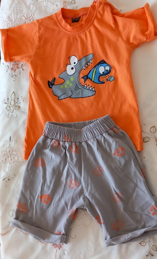 Pamuklu kumaştan, baskılı kısa kollu turuncu tişört ve gri şort içeren erkek bebek takımı. Yuvarlak yaka ve rahat kesim.